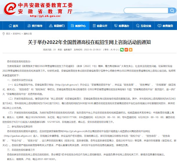新安晚报 安徽网 大皖新闻讯 据安徽省教育厅5月23日消息 为贯彻落实好《教育部关于做好2022年普通高校招生工作的通知》(教学〔2022〕1号)精神,着力帮助解决广大考生关心、社会关注的招生问题,切实做好安徽省2022年普通高校在皖招生的相关服务工作。经研究决定,安徽省教育招生考试院和安徽省教育厅信息中心将联合举办2022年在皖招生普通高校网上咨询公益活动。现将有关事宜通知如下: